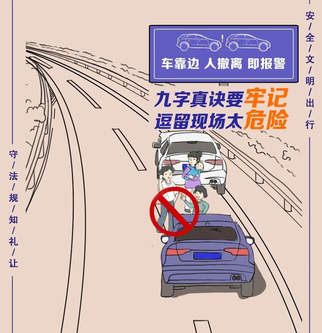 08牢记九字诀。如遇事故、车辆故障,一定要按照“车靠边、人撤离、即报警”的方式快速处置,避免发生“二次事故”。